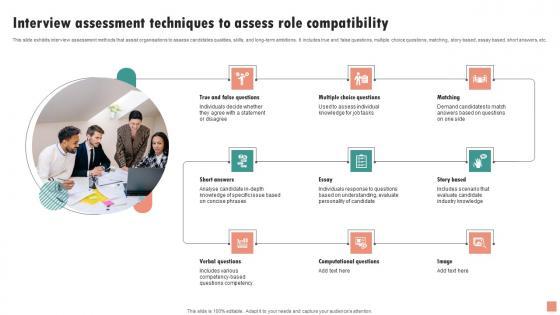 This slide exhibits interview assessment methods that assist organisations to assess candidates qualities, skills, and long-term ambitions. It includes true and false questions, multiple choice questions, matching, story based, essay based, short answers, etc. Showcasing this set of slides titled Interview Assessment Techniques To Assess Role Compatibility Background Pdf. The topics addressed in these templates are Multiple Choice Questions, Matching, Story Based, Essay Based, Short Answers. All the content presented in this PPT design is completely editable. Download it and make adjustments in color, background, font etc. as per your unique business setting. This slide exhibits interview assessment methods that assist organisations to assess candidates qualities, skills, and long-term ambitions. It includes true and false questions, multiple choice questions, matching, story based, essay based, short answers, etc.