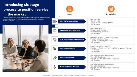 This slide shows various steps which can be used by organization for positioning service in the market . These steps are identify target steps, determine features, USP, etc. Are you in need of a template that can accommodate all of your creative concepts This one is crafted professionally and can be altered to fit any style. Use it with Google Slides or PowerPoint. Include striking photographs, symbols, depictions, and other visuals. Fill, move around, or remove text boxes as desired. Test out color palettes and font mixtures. Edit and save your work, or work with colleagues. Download Digital Advertising Strategies Introducing Six Stage Process To Position Mockup Pdf and observe how to make your presentation outstanding. Give an impeccable presentation to your group and make your presentation unforgettable. This slide shows various steps which can be used by organization for positioning service in the market . These steps are identify target steps, determine features, USP, etc.