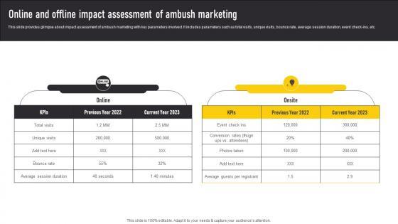 This slide provides glimpse about impact assessment of ambush marketing with key parameters involved. It includes parameters such as total visits, unique visits, bounce rate, average session duration, event check-ins, etc. Retrieve professionally designed Online And Offline Impact Assessment Of Ambush Automate Guerrilla Promotional Introduction Pdf to effectively convey your message and captivate your listeners. Save time by selecting pre-made slideshows that are appropriate for various topics, from business to educational purposes. These themes come in many different styles, from creative to corporate, and all of them are easily adjustable and can be edited quickly. Access them as PowerPoint templates or as Google Slides themes. You do not have to go on a hunt for the perfect presentation because Slidegeeks got you covered from everywhere. This slide provides glimpse about impact assessment of ambush marketing with key parameters involved. It includes parameters such as total visits, unique visits, bounce rate, average session duration, event check-ins, etc.