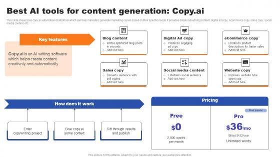 This slide showcases copy.ai automation chatbot tool which can help marketers generate marketing copies based on their specific needs. It provides details about blog content, digital ad copy, ecommerce copy, sales copy, social media content, etc. Crafting an eye-catching presentation has never been more straightforward. Let your presentation shine with this tasteful yet straightforward Best AI Tools For Content Generation Copyai Ppt Inspiration Introduction PDF template. It offers a minimalistic and classy look that is great for making a statement. The colors have been employed intelligently to add a bit of playfulness while still remaining professional. Construct the ideal Best AI Tools For Content Generation Copyai Ppt Inspiration Introduction PDF that effortlessly grabs the attention of your audience Begin now and be certain to wow your customers This slide showcases copy.ai automation chatbot tool which can help marketers generate marketing copies based on their specific needs. It provides details about blog content, digital ad copy, ecommerce copy, sales copy, social media content, etc.