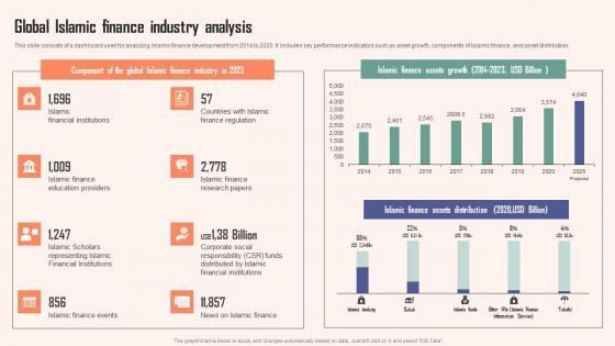 This slide consists of a dashboard used for analyzing Islamic finance development from 2014 to 2020. It includes key performance indicators such as asset growth, components of Islamic finance, and asset distribution. Retrieve professionally designed Global Islamic Finance Industry Analysis Comprehensive Guide Islamic Introduction PDF to effectively convey your message and captivate your listeners. Save time by selecting pre-made slideshows that are appropriate for various topics, from business to educational purposes. These themes come in many different styles, from creative to corporate, and all of them are easily adjustable and can be edited quickly. Access them as PowerPoint templates or as Google Slides themes. You do not have to go on a hunt for the perfect presentation because Slidegeeks got you covered from everywhere. This slide consists of a dashboard used for analyzing Islamic finance development from 2014 to 2020. It includes key performance indicators such as asset growth, components of Islamic finance, and asset distribution.