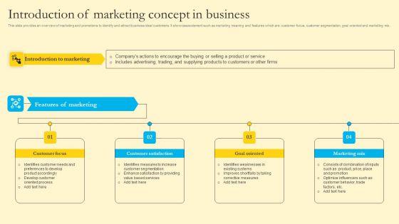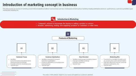 This slide provides an overview of marketing and promotions to identify and attract business ideal customers. It showcases element such as marketing meaning and features which are customer focus, customer segmentation, goal oriented and marketing mix. Slidegeeks is here to make your presentations a breeze with Marketing Mix Strategy Handbook Introduction Of Marketing Concept In Business Download PDF With our easy-to-use and customizable templates, you can focus on delivering your ideas rather than worrying about formatting. With a variety of designs to choose from, you are sure to find one that suits your needs. And with animations and unique photos, illustrations, and fonts, you can make your presentation pop. So whether you are giving a sales pitch or presenting to the board, make sure to check out Slidegeeks first