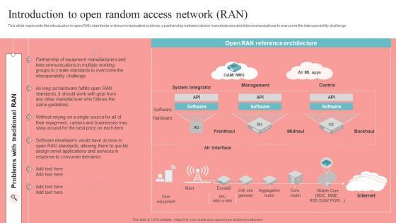 This slide represents the introduction to open RAN standards in telecommunication systems, a partnership between device manufacturers and telecommunications to overcome the interoperability challenge. Coming up with a presentation necessitates that the majority of the effort goes into the content and the message you intend to convey. The visuals of a PowerPoint presentation can only be effective if it supplements and supports the story that is being told. Keeping this in mind our experts created Open Radio Access Network IT Introduction To Open Random Access Network RAN Slides PDF to reduce the time that goes into designing the presentation. This way, you can concentrate on the message while our designers take care of providing you with the right template for the situation.
