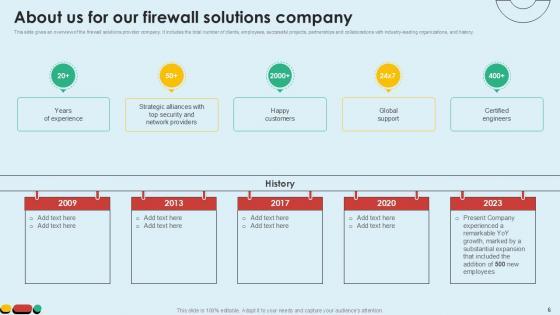 This slide gives an overview of the firewall solutions provider company. It includes the total number of clients, employees, successful projects, partnerships and collaborations with industry leading organizations, and history.Find a pre designed and impeccable About Us For Our Intelligent Intrusion Prevention System Ppt Template. The templates can ace your presentation without additional effort. You can download these easy to edit presentation templates to make your presentation stand out from others. So, what are you waiting for Download the template from Slidegeeks today and give a unique touch to your presentation. This slide gives an overview of the firewall solutions provider company. It includes the total number of clients, employees, successful projects, partnerships and collaborations with industry leading organizations, and history.