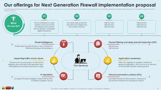 This slide represents the services offered by the firewall service provider company. It includes an overview of the company and the different services they offer, such as threat intelligence, inspecting traffic across layers, IP reputation, Intrusion Prevention Systems, and so on.Present like a pro with Our Offerings For Next Generation Intelligent Intrusion Prevention System Ppt Slide. Create beautiful presentations together with your team, using our easy to use presentation slides. Share your ideas in real time and make changes on the fly by downloading our templates. So whether you are in the office, on the go, or in a remote location, you can stay in sync with your team and present your ideas with confidence. With Slidegeeks presentation got a whole lot easier. Grab these presentations today. This slide represents the services offered by the firewall service provider company. It includes an overview of the company and the different services they offer, such as threat intelligence, inspecting traffic across layers, IP reputation, Intrusion Prevention Systems, and so on.