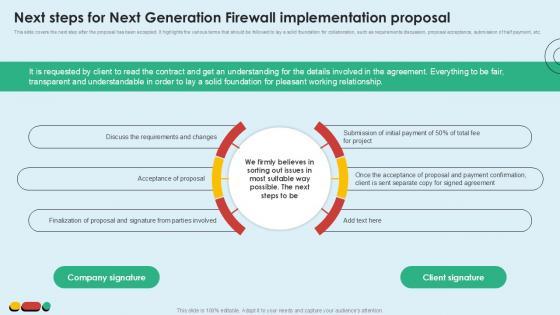 This slide covers the next step after the proposal has been accepted. It highlights the various terms that should be followed to lay a solid foundation for collaboration, such as requirements discussion, proposal acceptance, submission of half payment, etc.From laying roadmaps to briefing everything in detail, our templates are perfect for you. You can set the stage with your presentation slides. All you have to do is download these easy to edit and customizable templates. Next Steps For Next Generation Intelligent Intrusion Prevention System Ppt Template will help you deliver an outstanding performance that everyone would remember and praise you for. Do download this presentation today. This slide covers the next step after the proposal has been accepted. It highlights the various terms that should be followed to lay a solid foundation for collaboration, such as requirements discussion, proposal acceptance, submission of half payment, etc.