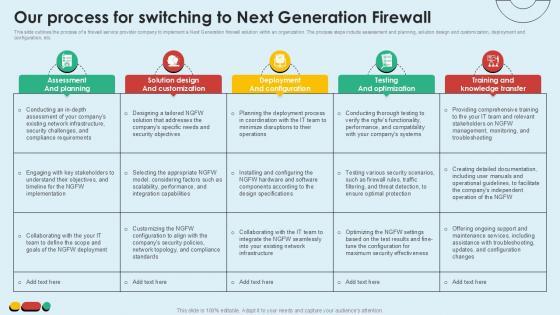 This slide outlines the process of a firewall service provider company to implement a Next Generation firewall solution within an organization. The process steps include assessment and planning, solution design and customization, deployment and configuration, etc.Slidegeeks is here to make your presentations a breeze with Our Process For Switching Intelligent Intrusion Prevention System Ppt Example With our easy to use and customizable templates, you can focus on delivering your ideas rather than worrying about formatting. With a variety of designs to choose from, you are sure to find one that suits your needs. And with animations and unique photos, illustrations, and fonts, you can make your presentation pop. So whether you are giving a sales pitch or presenting to the board, make sure to check out Slidegeeks first This slide outlines the process of a firewall service provider company to implement a Next Generation firewall solution within an organization. The process steps include assessment and planning, solution design and customization, deployment and configuration, etc.