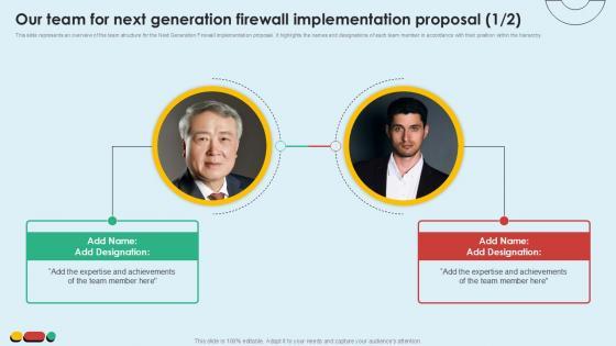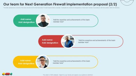 This slide represents an overview of the team structure for the Next Generation Firewall implementation proposal. It highlights the names and designations of each team member in accordance with their position within the hierarchy.Whether you have daily or monthly meetings, a brilliant presentation is necessary. Our Team For Next Generation Intelligent Intrusion Prevention System Ppt Slide can be your best option for delivering a presentation. Represent everything in detail using Our Team For Next Generation Intelligent Intrusion Prevention System Ppt Slide and make yourself stand out in meetings. The template is versatile and follows a structure that will cater to your requirements. All the templates prepared by Slidegeeks are easy to download and edit. Our research experts have taken care of the corporate themes as well. So, give it a try and see the results. This slide represents an overview of the team structure for the Next Generation Firewall implementation proposal. It highlights the names and designations of each team member in accordance with their position within the hierarchy.