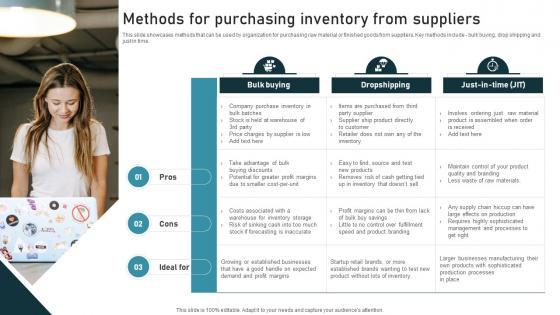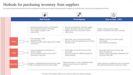 This slide showcases methods that can be used by organization for purchasing raw material or finished goods from suppliers. Key methods include bulk buying, drop shipping and just in time. The best PPT templates are a great way to save time, energy, and resources. Slidegeeks have 100 percent editable powerpoint slides making them incredibly versatile. With these quality presentation templates, you can create a captivating and memorable presentation by combining visually appealing slides and effectively communicating your message. Download Methods For Purchasing Inventory From Suppliers Tactical Guide Stock Administration Template Pdf from Slidegeeks and deliver a wonderful presentation. This slide showcases methods that can be used by organization for purchasing raw material or finished goods from suppliers. Key methods include bulk buying, drop shipping and just in time.