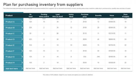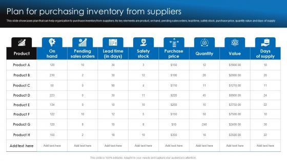 This slide showcases plan that can help organization to purchase inventory from suppliers. Its key elements are product, on hand, pending sales orders, lead time, safety stock, purchase price, quantity value and days of supply. The Plan For Purchasing Inventory From Suppliers Mockup PDF is a compilation of the most recent design trends as a series of slides. It is suitable for any subject or industry presentation, containing attractive visuals and photo spots for businesses to clearly express their messages. This template contains a variety of slides for the user to input data, such as structures to contrast two elements, bullet points, and slides for written information. Slidegeeks is prepared to create an impression.