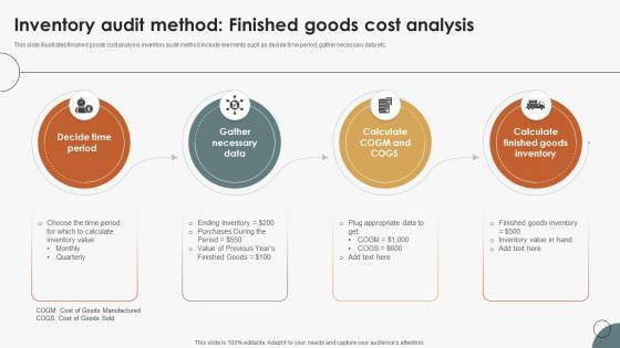 This slide illustrates finished goods cost analysis inventory audit method include elements such as decide time period, gather necessary data etc. Presenting this PowerPoint presentation, titled Inventory Audit Method Finished Goods Cost Analysis Boosting Efficiency In Inventory Auditing, with topics curated by our researchers after extensive research. This editable presentation is available for immediate download and provides attractive features when used. Download now and captivate your audience. Presenting this Inventory Audit Method Finished Goods Cost Analysis Boosting Efficiency In Inventory Auditing. Our researchers have carefully researched and created these slides with all aspects taken into consideration. This is a completely customizable Inventory Audit Method Finished Goods Cost Analysis Boosting Efficiency In Inventory Auditing that is available for immediate downloading. Download now and make an impact on your audience. Highlight the attractive features available with our PPTs. This slide illustrates finished goods cost analysis inventory audit method include elements such as decide time period, gather necessary data etc.