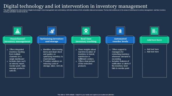 This slide highlights the interventions of digital technology in stock management and control along with interventions of iot to streamline data and processes. The key interventions are in the areas of omnichannel inventory management, real time inventory tracking, automated reorder levels etc. Showcasing this set of slides titled Digital Technology And Iot Intervention In Inventory Management Themes Pdf. The topics addressed in these templates are Omnichannel Inventory Management, Real Time Inventory Tracking, Automated Reorder Levels. All the content presented in this PPT design is completely editable. Download it and make adjustments in color, background, font etc. as per your unique business setting. This slide highlights the interventions of digital technology in stock management and control along with interventions of iot to streamline data and processes. The key interventions are in the areas of omnichannel inventory management, real time inventory tracking, automated reorder levels etc.