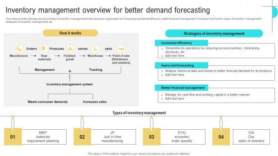 This slide provides glimpse about summary of inventory management in the business organization for increasing operational efficiency, better financial management. It includes how it works, types of inventory management, strategies of inventory management, etc. Make sure to capture your audiences attention in your business displays with our gratis customizable Inventory Management Overview Business Performance Optimization New Operations Strategy Summary Pdf. These are great for business strategies, office conferences, capital raising or task suggestions. If you desire to acquire more customers for your tech business and ensure they stay satisfied, create your own sales presentation with these plain slides. This slide provides glimpse about summary of inventory management in the business organization for increasing operational efficiency, better financial management. It includes how it works, types of inventory management, strategies of inventory management, etc.
