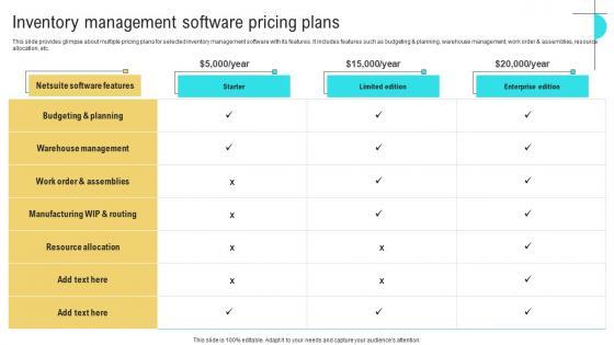 This slide provides glimpse about multiple pricing plans for selected inventory management software with its features. It includes features such as budgeting and planning, warehouse management, work order and assemblies, resource allocation, etc. Formulating a presentation can take up a lot of effort and time, so the content and message should always be the primary focus. The visuals of the PowerPoint can enhance the presenters message, so our Inventory Management Software Business Performance Optimization New Operations Strategy Demonstration Pdf was created to help save time. Instead of worrying about the design, the presenter can concentrate on the message while our designers work on creating the ideal templates for whatever situation is needed. Slidegeeks has experts for everything from amazing designs to valuable content, we have put everything into Inventory Management Software Business Performance Optimization New Operations Strategy Demonstration Pdf This slide provides glimpse about multiple pricing plans for selected inventory management software with its features. It includes features such as budgeting and planning, warehouse management, work order and assemblies, resource allocation, etc.