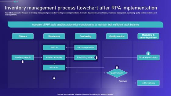 This slide illustrates the flowchart of inventory management process after robotic process implementation. It includes department such as finance, warehouse management, purchasing, quality control, marketing and sale department. Take your projects to the next level with our ultimate collection of Inventory Management Process Flowchart After Embracing Robotic Process Information PDF. Slidegeeks has designed a range of layouts that are perfect for representing task or activity duration, keeping track of all your deadlines at a glance. Tailor these designs to your exact needs and give them a truly corporate look with your own brand colors they will make your projects stand out from the rest This slide illustrates the flowchart of inventory management process after robotic process implementation. It includes department such as finance, warehouse management, purchasing, quality control, marketing and sale department.
