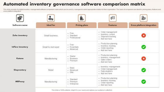 This slide consists of a digital inventory management software comparison matrix which can be used by managers to select appropriate solution for their organization. The basis of comparison are ideal for, pricing plans, features and cross platform integration Showcasing this set of slides titled Automated Inventory Governance Software Comparison Matrix Slides Pdf. The topics addressed in these templates are Pricing Plans, Features, Platform Integration. All the content presented in this PPT design is completely editable. Download it and make adjustments in color, background, font etc. as per your unique business setting. This slide consists of a digital inventory management software comparison matrix which can be used by managers to select appropriate solution for their organization. The basis of comparison are ideal for, pricing plans, features and cross platform integration