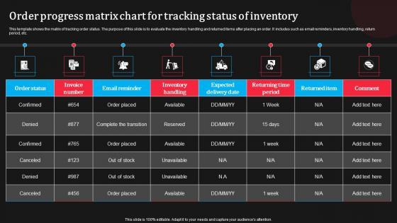 This template shows the matrix of tracking order status. The purpose of this slide is to evaluate the inventory handling and returned items after placing an order. It includes such as email reminders, inventory handling, return period, etc.Showcasing this set of slides titled Order Progress Matrix Chart For Tracking Status Of Inventory Infographics Pdf The topics addressed in these templates are Inventory Handling, Expected Delivery, Returned Item All the content presented in this PPT design is completely editable. Download it and make adjustments in color, background, font etc. as per your unique business setting. This template shows the matrix of tracking order status. The purpose of this slide is to evaluate the inventory handling and returned items after placing an order. It includes such as email reminders, inventory handling, return period, etc.
