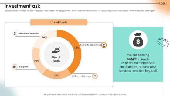 This slide provides information about the funding requirement of content marketing platforms. It showcases the allocation of funds in key areas such as new technological tools, platform maintenance, and hiring staff. If your project calls for a presentation, then Slidegeeks is your go-to partner because we have professionally designed, easy-to-edit templates that are perfect for any presentation. After downloading, you can easily edit Investment Ask Content Marketing Platform Investor Funding Elevator Pitch Deck and make the changes accordingly. You can rearrange slides or fill them with different images. Check out all the handy templates This slide provides information about the funding requirement of content marketing platforms. It showcases the allocation of funds in key areas such as new technological tools, platform maintenance, and hiring staff.