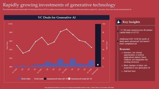 This slide showcases how generative AI technology similar to GPT 4 is getting investment interest. It provides details about venture capital VC, deal value, deal count, announced investment, etc. The Rapidly Growing Investments GPT 4 Revolutionary Generative AI Innovation Icons Pdf is a compilation of the most recent design trends as a series of slides. It is suitable for any subject or industry presentation, containing attractive visuals and photo spots for businesses to clearly express their messages. This template contains a variety of slides for the user to input data, such as structures to contrast two elements, bullet points, and slides for written information. Slidegeeks is prepared to create an impression. This slide showcases how generative AI technology similar to GPT 4 is getting investment interest. It provides details about venture capital VC, deal value, deal count, announced investment, etc.
