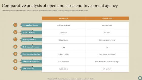 The slide showcases a comparative analysis of key characteristics of two types of investment companies . It compares open end vs close end investment company. Showcasing this set of slides titled Comparative Analysis Of Open And Close End Investment Agency Themes Pdf. The topics addressed in these templates are Outstanding Shares, Public Offering, Redemption Price. All the content presented in this PPT design is completely editable. Download it and make adjustments in color, background, font etc. as per your unique business setting. The slide showcases a comparative analysis of key characteristics of two types of investment companies . It compares open end vs close end investment company.