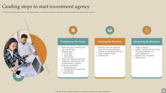 The slide showcases a guide to start an investing company. It covers making preliminary decisions, forming the business and marketing the business. Showcasing this set of slides titled Guiding Steps To Start Investment Agency Sample Pdf. The topics addressed in these templates are Preliminary Decisions, Forming The Business, Marketing The Business. All the content presented in this PPT design is completely editable. Download it and make adjustments in color, background, font etc. as per your unique business setting. The slide showcases a guide to start an investing company. It covers making preliminary decisions, forming the business and marketing the business.