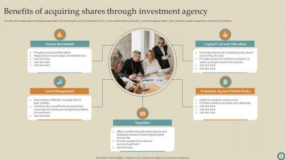 The slide showcases major advantages associated with investing through an investment firm. It covers capital cost and allocation, protection against hidden risks, expertise, asset management and secure investment. Showcasing this set of slides titled Benefits Of Acquiring Shares Through Investment Agency Template Pdf. The topics addressed in these templates are Secure Investment, Asset Management, Investment Agency. All the content presented in this PPT design is completely editable. Download it and make adjustments in color, background, font etc. as per your unique business setting. The slide showcases major advantages associated with investing through an investment firm. It covers capital cost and allocation, protection against hidden risks, expertise, asset management and secure investment.