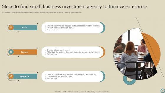 The slide showcases steps to find small business investment firm to finance your enterprise. It covers research, prepare and pitch. Showcasing this set of slides titled Steps To Find Small Business Investment Agency To Finance Enterprise Professional Pdf. The topics addressed in these templates are Research, Prepare, Finance Enterprise. All the content presented in this PPT design is completely editable. Download it and make adjustments in color, background, font etc. as per your unique business setting. The slide showcases steps to find small business investment firm to finance your enterprise. It covers research, prepare and pitch.