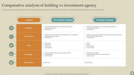 The slide showcases a comparative analysis which helps in understanding the distinction between holding and investment company. It covers aspects like description, areas of focus, types and advantages. Pitch your topic with ease and precision using this Comparative Analysis Of Holding Vs Investment Agency Ideas Pdf. This layout presents information on Investment Company, Holding Company, Investment Agency. It is also available for immediate download and adjustment. So, changes can be made in the color, design, graphics or any other component to create a unique layout. The slide showcases a comparative analysis which helps in understanding the distinction between holding and investment company. It covers aspects like description, areas of focus, types and advantages.