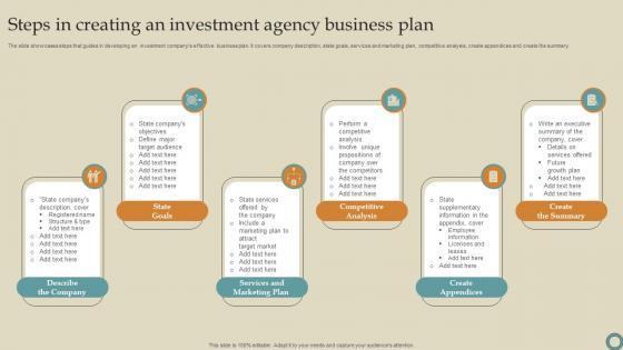 The slide showcases steps that guides in developing an investment companys effective business plan. It covers company description, state goals, services and marketing plan, competitive analysis, create appendices and create the summary. Pitch your topic with ease and precision using this Steps In Creating An Investment Agency Business Plan Designs Pdf. This layout presents information on State Goals, Competitive Analysis, Create Appendices. It is also available for immediate download and adjustment. So, changes can be made in the color, design, graphics or any other component to create a unique layout. The slide showcases steps that guides in developing an investment companys effective business plan. It covers company description, state goals, services and marketing plan, competitive analysis, create appendices and create the summary.