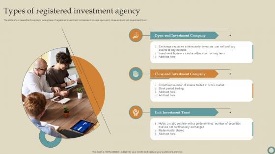 The slide showcases the three major categories of registered investment companies.it covers open end, close end and unit investment trust. Pitch your topic with ease and precision using this Types Of Registered Investment Agency Structure Pdf. This layout presents information on Open End Investment Company, Unit Investment Trust. It is also available for immediate download and adjustment. So, changes can be made in the color, design, graphics or any other component to create a unique layout. The slide showcases the three major categories of registered investment companies.it covers open end, close end and unit investment trust.