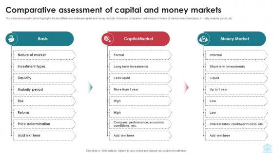 This slide shows matrix which highlights the key differences between capital and money markets. It includes comparison on the basis of nature of market, investment types, liquidity, maturity period, etc. Slidegeeks is here to make your presentations a breeze with Comparative Assessment Of Capital And Money Markets Mastering Investment Banking Fin SS V With our easy-to-use and customizable templates, you can focus on delivering your ideas rather than worrying about formatting. With a variety of designs to choose from, you are sure to find one that suits your needs. And with animations and unique photos, illustrations, and fonts, you can make your presentation pop. So whether you are giving a sales pitch or presenting to the board, make sure to check out Slidegeeks first This slide shows matrix which highlights the key differences between capital and money markets. It includes comparison on the basis of nature of market, investment types, liquidity, maturity period, etc.