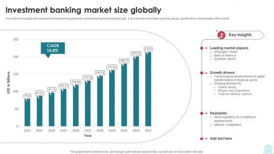 This slide shows graph which represent current and forecasted size of investment banking market globally . It also includes information about key players, growth drivers and restraints of the market. Explore a selection of the finest Investment Banking Market Size Globally Mastering Investment Banking Fin SS V here. With a plethora of professionally designed and pre-made slide templates, you can quickly and easily find the right one for your upcoming presentation. You can use our Investment Banking Market Size Globally Mastering Investment Banking Fin SS V to effectively convey your message to a wider audience. Slidegeeks has done a lot of research before preparing these presentation templates. The content can be personalized and the slides are highly editable. Grab templates today from Slidegeeks. This slide shows graph which represent current and forecasted size of investment banking market globally . It also includes information about key players, growth drivers and restraints of the market.