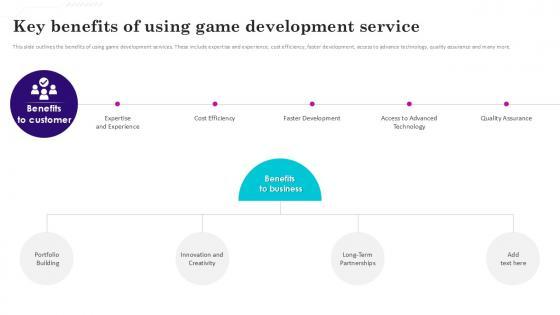 This slide outlines the benefits of using game development services. These include expertise and experience, cost efficiency, faster development, access to advance technology, quality assurance and many more. Slidegeeks is here to make your presentations a breeze with Key Benefits Of Using Game Gaming Venture Investment Elevator Pitch Deck Ppt Example With our easy-to-use and customizable templates, you can focus on delivering your ideas rather than worrying about formatting. With a variety of designs to choose from, you are sure to find one that suits your needs. And with animations and unique photos, illustrations, and fonts, you can make your presentation pop. So whether you are giving a sales pitch or presenting to the board, make sure to check out Slidegeeks first This slide outlines the benefits of using game development services. These include expertise and experience, cost efficiency, faster development, access to advance technology, quality assurance and many more.