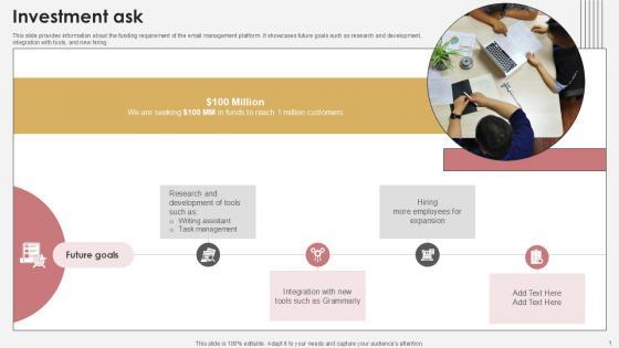 This slide provides information about the funding requirement of the email management platform. It showcases future goals such as research and development, integration with tools, and new hiring. Find highly impressive Investment Ask Communication Tech Company Pitch Deck PPT Presentation on Slidegeeks to deliver a meaningful presentation. You can save an ample amount of time using these presentation templates. No need to worry to prepare everything from scratch because Slidegeeks experts have already done a huge research and work for you. You need to download Investment Ask Communication Tech Company Pitch Deck PPT Presentation for your upcoming presentation. All the presentation templates are 100 percent editable and you can change the color and personalize the content accordingly. Download now This slide provides information about the funding requirement of the email management platform. It showcases future goals such as research and development, integration with tools, and new hiring.