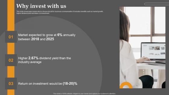 This slide showcases reason why to choose Aircall for business communication. It includes benefits such as market growth, higher dividend yield and return on investment. Welcome to our selection of the Why Invest With Us Business Communication Improvement Platform Investor Clipart Pdf. These are designed to help you showcase your creativity and bring your sphere to life. Planning and Innovation are essential for any business that is just starting out. This collection contains the designs that you need for your everyday presentations. All of our PowerPoints are 100 percent editable, so you can customize them to suit your needs. This multi purpose template can be used in various situations. Grab these presentation templates today This slide showcases reason why to choose Aircall for business communication. It includes benefits such as market growth, higher dividend yield and return on investment.