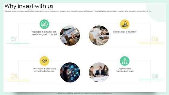 This slide shows information about various factors which can be considered by investors while making the investment decision. It includes factors such as rapidly growing market, innovative product offering, etc. The best PPT templates are a great way to save time, energy, and resources. Slidegeeks have 100 percent editable powerpoint slides making them incredibly versatile. With these quality presentation templates, you can create a captivating and memorable presentation by combining visually appealing slides and effectively communicating your message. Download Why Invest With Us Document Creation Software Company Fundraising Ppt Template from Slidegeeks and deliver a wonderful presentation. This slide shows information about various factors which can be considered by investors while making the investment decision. It includes factors such as rapidly growing market, innovative product offering, etc.