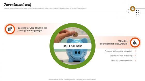 This slide represents the information related to the investment requirements to the investors for seeking needed funds and the purpose of seeking finance. There are so many reasons you need a Investment Ask On Demand Food Delivery Platform Investor Funding Elevator Pitch Deck. The first reason is you can not spend time making everything from scratch, Thus, Slidegeeks has made presentation templates for you too. You can easily download these templates from our website easily. This slide represents the information related to the investment requirements to the investors for seeking needed funds and the purpose of seeking finance.