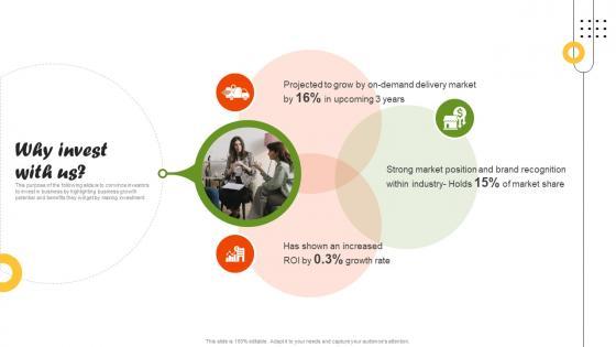 This purpose of the following slide is to convince investors to invest in business by highlighting business growth potential and benefits they will get by making investment. Want to ace your presentation in front of a live audience Our Why Invest With Us On Demand Food Delivery Platform Investor Funding Elevator Pitch Deck can help you do that by engaging all the users towards you. Slidegeeks experts have put their efforts and expertise into creating these impeccable powerpoint presentations so that you can communicate your ideas clearly. Moreover, all the templates are customizable, and easy-to-edit and downloadable. Use these for both personal and commercial use. This purpose of the following slide is to convince investors to invest in business by highlighting business growth potential and benefits they will get by making investment.