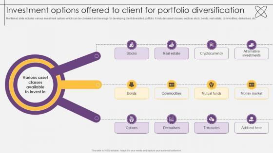 Mentioned slide includes various investment options which can be combined and leverage for developing client diversified portfolio.It includes asset classes, such as stock, bonds, real estate, commodities, derivatives, etc. The best PPT templates are a great way to save time, energy, and resources. Slidegeeks have 100 percent editable powerpoint slides making them incredibly versatile. With these quality presentation templates, you can create a captivating and memorable presentation by combining visually appealing slides and effectively communicating your message. Download Investment Options Offered To Client For Portfolio Diversification Investment Fund PPT Example from Slidegeeks and deliver a wonderful presentation. Mentioned slide includes various investment options which can be combined and leverage for developing client diversified portfolio.It includes asset classes, such as stock, bonds, real estate, commodities, derivatives, etc.