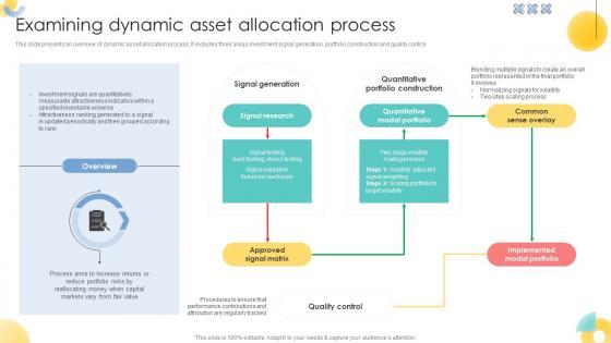 This slide presents an overview of dynamic asset allocation process. It includes three areas investment signal generation, portfolio construction and quality control.Make sure to capture your audiences attention in your business displays with our gratis customizable Examining Dynamic Asset Allocation Process Strategic Investment Plan For Optimizing Risk SS V. These are great for business strategies, office conferences, capital raising or task suggestions. If you desire to acquire more customers for your tech business and ensure they stay satisfied, create your own sales presentation with these plain slides. This slide presents an overview of dynamic asset allocation process. It includes three areas investment signal generation, portfolio construction and quality control.