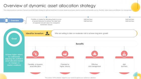 This slide presents an overview of dynamic asset allocation strategy for optimal investment. It includes details about goals, ideal for investors and benefits such as, flexibility, higher returns and effective risk management.Create an editable Overview Of Dynamic Asset Allocation Strategy Strategic Investment Plan For Optimizing Risk SS V that communicates your idea and engages your audience. Whether you are presenting a business or an educational presentation, pre-designed presentation templates help save time. Overview Of Dynamic Asset Allocation Strategy Strategic Investment Plan For Optimizing Risk SS V is highly customizable and very easy to edit, covering many different styles from creative to business presentations. Slidegeeks has creative team members who have crafted amazing templates. So, go and get them without any delay. This slide presents an overview of dynamic asset allocation strategy for optimal investment. It includes details about goals, ideal for investors and benefits such as, flexibility, higher returns and effective risk management.