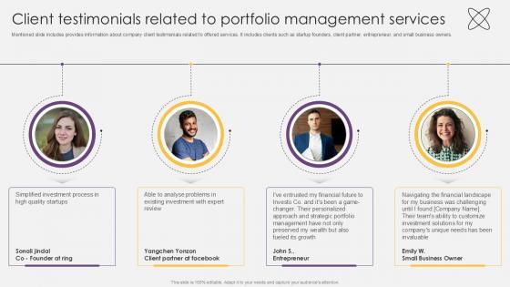 Mentioned slide includes provides information about company client testimonials related to offered services.It includes clients such as startup founders, client partner, entrepreneur, and small business owners. Present like a pro with Client Testimonials Related To Portfolio Management Services Investment Fund PPT Example. Create beautiful presentations together with your team, using our easy to use presentation slides. Share your ideas in real time and make changes on the fly by downloading our templates. So whether you are in the office, on the go, or in a remote location, you can stay in sync with your team and present your ideas with confidence. With Slidegeeks presentation got a whole lot easier. Grab these presentations today. Mentioned slide includes provides information about company client testimonials related to offered services.It includes clients such as startup founders, client partner, entrepreneur, and small business owners.