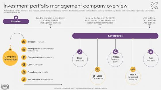 Mentioned slide provides information about various investment management company overviews.It includes key elements such as about us, company information, key statistics related to branches, experiences, customer base, investment advisors, etc. Slidegeeks has constructed Investment Portfolio Management Company Overview Investment Fund PPT Presentation after conducting extensive research and examination. These presentation templates are constantly being generated and modified based on user preferences and critiques from editors. Here, you will find the most attractive templates for a range of purposes while taking into account ratings and remarks from users regarding the content. This is an excellent jumping off point to explore our content and will give new users an insight into our top notch PowerPoint Templates. Mentioned slide provides information about various investment management company overviews.It includes key elements such as about us, company information, key statistics related to branches, experiences, customer base, investment advisors, etc.