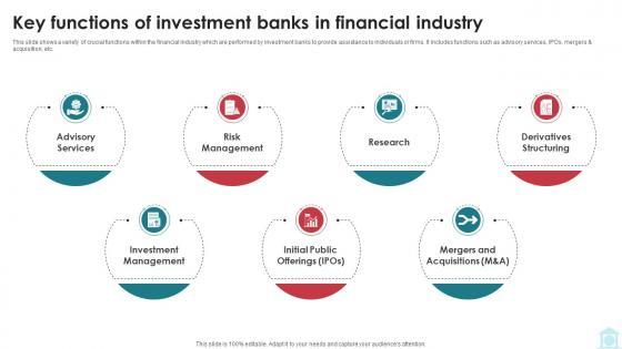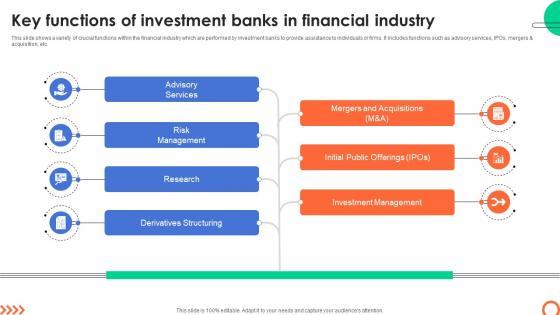 This slide shows a variety of crucial functions within the financial industry which are performed by investment banks to provide assistance to individuals or firms. It includes functions such as advisory services, IPOs, mergers and acquisition, etc. Retrieve professionally designed Key Functions Of Investment Banks In Financial Industry Mastering Investment Banking Fin SS V to effectively convey your message and captivate your listeners. Save time by selecting pre-made slideshows that are appropriate for various topics, from business to educational purposes. These themes come in many different styles, from creative to corporate, and all of them are easily adjustable and can be edited quickly. Access them as PowerPoint templates or as Google Slides themes. You do not have to go on a hunt for the perfect presentation because Slidegeeks got you covered from everywhere. This slide shows a variety of crucial functions within the financial industry which are performed by investment banks to provide assistance to individuals or firms. It includes functions such as advisory services, IPOs, mergers and acquisition, etc.