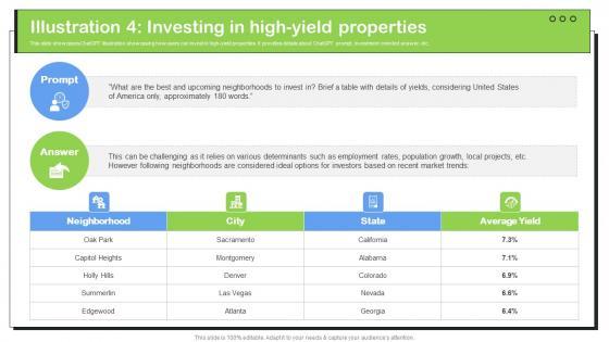 This slide showcases ChatGPT illustration showcasing how users can invest in high-yield properties. It provides details about ChatGPT prompt, investment oriented answer, etc. Presenting this PowerPoint presentation, titled Transforming Real Estate Illustration 4 Investing In High Yield Properties ChatGPT SS V, with topics curated by our researchers after extensive research. This editable presentation is available for immediate download and provides attractive features when used. Download now and captivate your audience. Presenting this Transforming Real Estate Illustration 4 Investing In High Yield Properties ChatGPT SS V. Our researchers have carefully researched and created these slides with all aspects taken into consideration. This is a completely customizable Transforming Real Estate Illustration 4 Investing In High Yield Properties ChatGPT SS V that is available for immediate downloading. Download now and make an impact on your audience. Highlight the attractive features available with our PPTs. This slide showcases ChatGPT illustration showcasing how users can invest in high-yield properties. It provides details about ChatGPT prompt, investment oriented answer, etc.