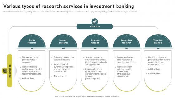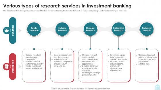 This slide shows information regarding various research functions of investment banking. It includes functions such as equity, industry, strategic, customized and other types of research. Retrieve professionally designed Various Types Of Research Services In Understanding Investment Banking Framework Fin SS V to effectively convey your message and captivate your listeners. Save time by selecting pre-made slideshows that are appropriate for various topics, from business to educational purposes. These themes come in many different styles, from creative to corporate, and all of them are easily adjustable and can be edited quickly. Access them as PowerPoint templates or as Google Slides themes. You do not have to go on a hunt for the perfect presentation because Slidegeeks got you covered from everywhere. This slide shows information regarding various research functions of investment banking. It includes functions such as equity, industry, strategic, customized and other types of research.