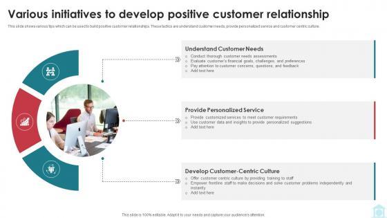 This slide shows various tips which can be used to build positive customer relationships. These tactics are understand customer needs, provide personalized service and customer centric culture. Make sure to capture your audiences attention in your business displays with our gratis customizable Various Initiatives To Develop Positive Customer Mastering Investment Banking Fin SS V These are great for business strategies, office conferences, capital raising or task suggestions. If you desire to acquire more customers for your tech business and ensure they stay satisfied, create your own sales presentation with these plain slides. This slide shows various tips which can be used to build positive customer relationships. These tactics are understand customer needs, provide personalized service and customer centric culture.