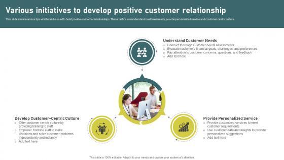 This slide shows various tips which can be used to build positive customer relationships. These tactics are understand customer needs, provide personalized service and customer centric culture. Are you searching for a Various Initiatives To Develop Positive Understanding Investment Banking Framework Fin SS V that is uncluttered, straightforward, and original Its easy to edit, and you can change the colors to suit your personal or business branding. For a presentation that expresses how much effort you have put in, this template is ideal With all of its features, including tables, diagrams, statistics, and lists, its perfect for a business plan presentation. Make your ideas more appealing with these professional slides. Download Various Initiatives To Develop Positive Understanding Investment Banking Framework Fin SS V from Slidegeeks today. This slide shows various tips which can be used to build positive customer relationships. These tactics are understand customer needs, provide personalized service and customer centric culture.