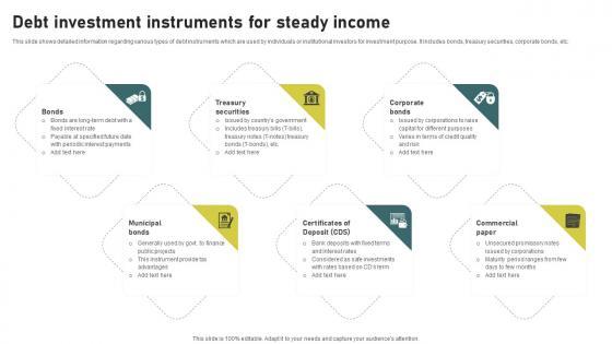 This slide shows detailed information regarding various types of debt instruments which are used by individuals or institutional investors for investment purpose. It includes bonds, treasury securities, corporate bonds, etc. If your project calls for a presentation, then Slidegeeks is your go-to partner because we have professionally designed, easy-to-edit templates that are perfect for any presentation. After downloading, you can easily edit Debt Investment Instruments For Steady Income Mastering Investment Banking Fin SS V and make the changes accordingly. You can rearrange slides or fill them with different images. Check out all the handy templates This slide shows detailed information regarding various types of debt instruments which are used by individuals or institutional investors for investment purpose. It includes bonds, treasury securities, corporate bonds, etc.