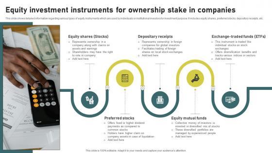 This slide shows detailed information regarding various types of equity instruments which are used by individuals or institutional investors for investment purpose. It includes equity shares, preferred stocks, depository receipts, etc. Formulating a presentation can take up a lot of effort and time, so the content and message should always be the primary focus. The visuals of the PowerPoint can enhance the presenters message, so our Equity Investment Instruments For Ownership Stake Mastering Investment Banking Fin SS V was created to help save time. Instead of worrying about the design, the presenter can concentrate on the message while our designers work on creating the ideal templates for whatever situation is needed. Slidegeeks has experts for everything from amazing designs to valuable content, we have put everything into Equity Investment Instruments For Ownership Stake Mastering Investment Banking Fin SS V This slide shows detailed information regarding various types of equity instruments which are used by individuals or institutional investors for investment purpose. It includes equity shares, preferred stocks, depository receipts, etc.